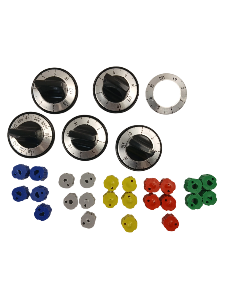Includes 5 x Knob; 5 x Blue/Green/Gray/Red/Yellow Insert (each of color 5pcs); 4 x Surface Inlay CCW; 4 x Surface Inlay CW; 1 x Thermostat Inlay 150 degree - 500 degree w/broil; 1 x CW to ON Inlay.